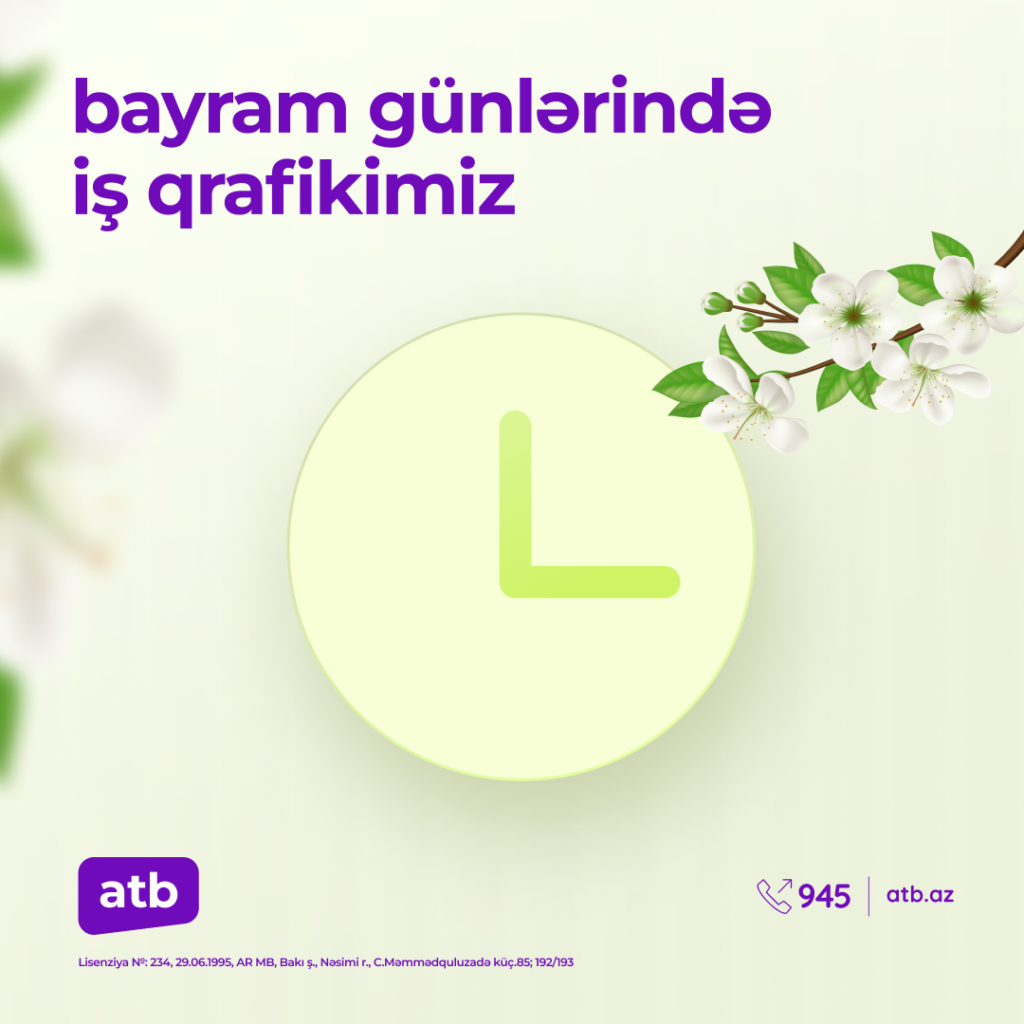 Информируем вас о том, что в связи с праздничными нерабочими днями, с целью оперативного рассмотрения обращений, обработки кредитных заявок и оформления дебетовых карт, филиалы Azər Türk Bank в Нахчыване, Гяндже и Ширване, офис МСБ в Сумгаите, а также «Rəqəmsal» филиал и филиалы «Rəqəmsal», «Rəqəmsal 6», «Rəqəmsal 8», «Rəqəmsal 9» и «Rəqəmsal X» будут работать 27, 28 и 30 марта с 10:00 до 14:00. Филиал «Rəqəmsal 4» будет функционировать в те же часы только 27 марта.